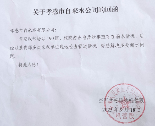 “真的太感謝你們了,沒有你們的幫助靠我們自己是真的修不好這漏水啊!”9月20日下午,空軍孝感廠站機(jī)營股工作人員將一封感謝信送到了市自來水有限公司。