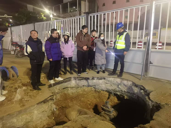 盡管寒風(fēng)凜冽,施工現(xiàn)場卻是一片繁忙景象,燈火輝煌。挖掘機(jī)械設(shè)備緊張作業(yè),工人們有序地進(jìn)行著供水管道連接前的準(zhǔn)備工作。設(shè)計(jì)造價人員仔細(xì)觀察,詳細(xì)記錄,并不時向現(xiàn)場施工人員和技術(shù)人員提出問題,深入掌握施工流程和關(guān)鍵技術(shù)。