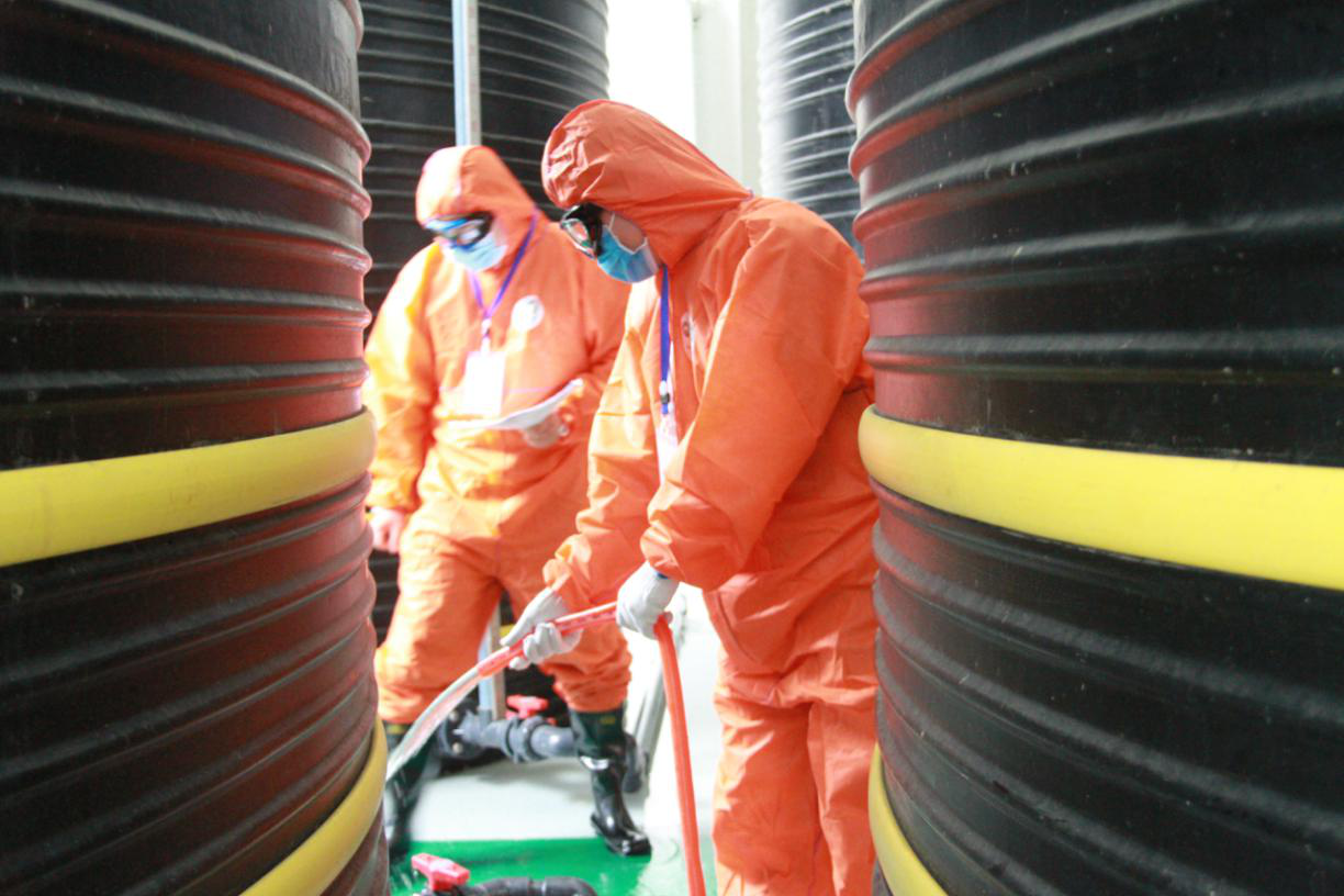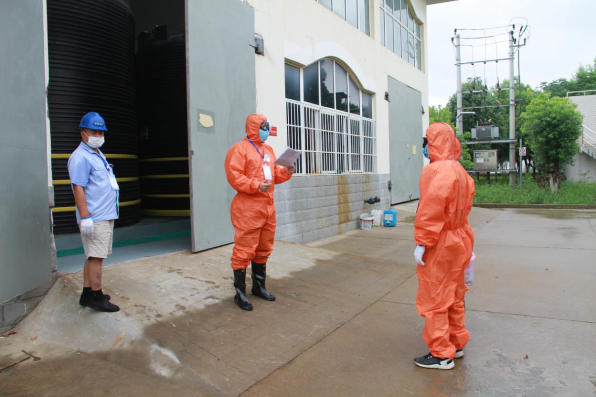 此次演練是以正在使用中的儲液罐的底部破裂,導致次氯酸鈉大量外泄為背景。當天上午9:30分,演練正式開始。值班人員在巡視過程中被次氯酸鈉藥劑噴濺至手臂受傷,值班班長立即報告總指揮,總指揮下令立刻全面啟動次氯酸鈉應急處置預案,通訊聯絡組、醫療救護組、安全疏散組、現場處置組前往現場開展救援及搶修。